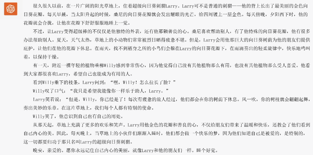 ChatGPT说没有问题,马上写了一个故事出来。在这个故事中,柳树“Willy”闷闷不乐,它说它帮助不了其他人。超级向日葵刺猬“Larry”却安慰它:你已经帮助了其他人,当疲倦的旅客在你的树荫之下享受清凉的时候,你就帮助了他们。每个人都有特别的使命。这时候Willy意识到,我们每个人都有自己的用处: