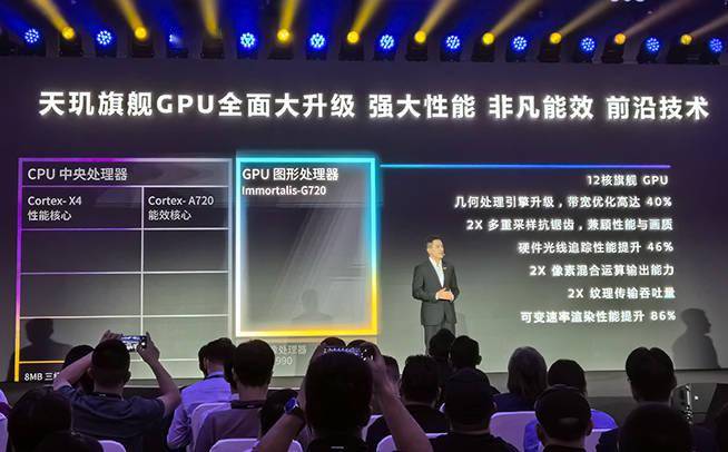 GPU方面,天玑9300搭配12核G720旗舰GPU,峰值性能相比天玑9200猛涨46%,相同性能下,GPU功耗相比天玑9200降低40%。