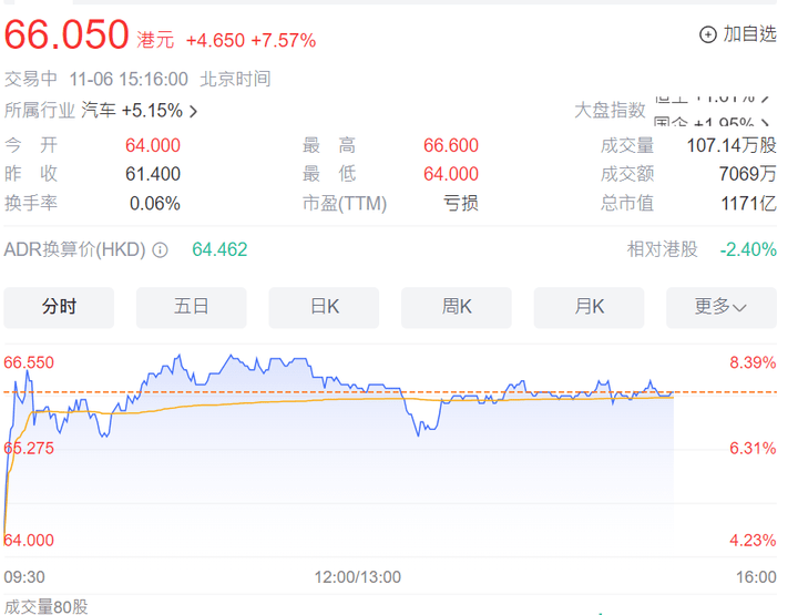 去年3月,蔚来回港上市,首日开盘价为160港元。对比去年高点199.2港元/股,截至11月6日15:15的66.05港元/股,蔚来的股价回撤幅度近67%。