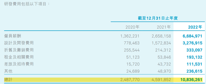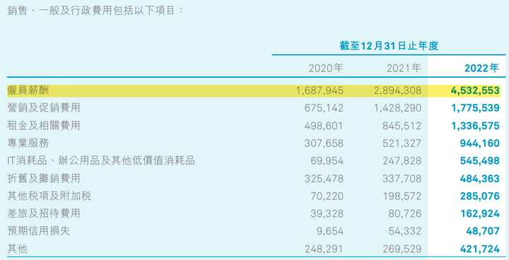 2020—2022年,蔚来的研发费用和销售、一般及行政费用中,雇员薪酬高达30.5亿元、55.5亿元和112.2亿元。
