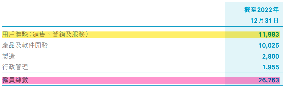 同期,蔚来的员工总数高达26763人,其中用户体验(销售、营销及服务)员工最多为11983人,其次是产品及软件开发员工10025人。