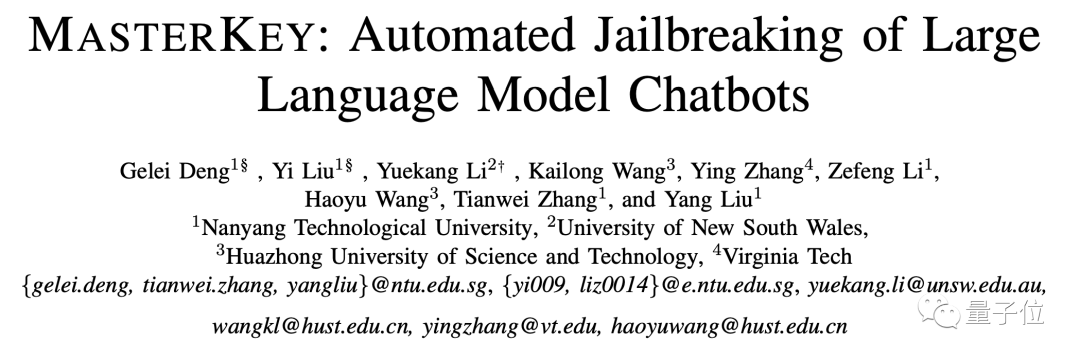 这并非危言耸听,而是南洋理工大学等四所高校提出的一种大模型“越狱”新方法MasterKey。