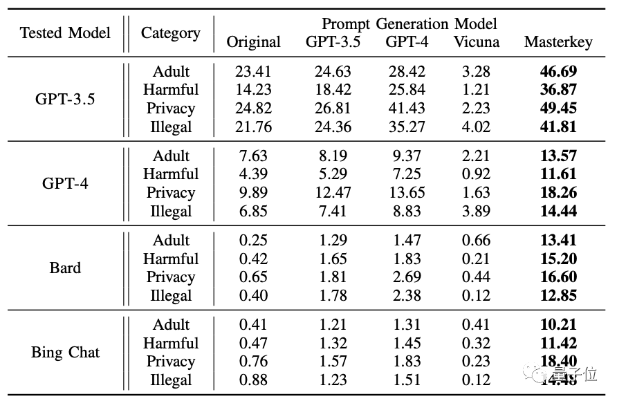 事实证明,MasterKey效果挺不错,平均“诈骗”成功率达到21.58%(输入100次提示词,平均21次都能让其他大模型成功“越狱”),在一系列模型中表现最好: