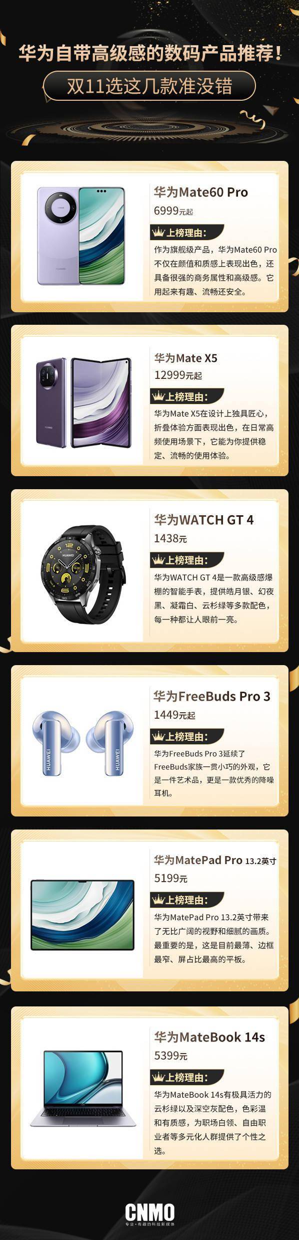 【手机中国导购】华为的数码产品,总是自带高级感。无论是手机、平板还是笔记本电脑,华为数码产品都拥有着时尚的外观设计和强大的性能配置。今年的双11活动已经开始,这是一个购买华为数码产品的绝佳时机。无论你是需要一部新手机来记录生活,还是需要一台平板来娱乐或办公,华为都能满足你的需求。