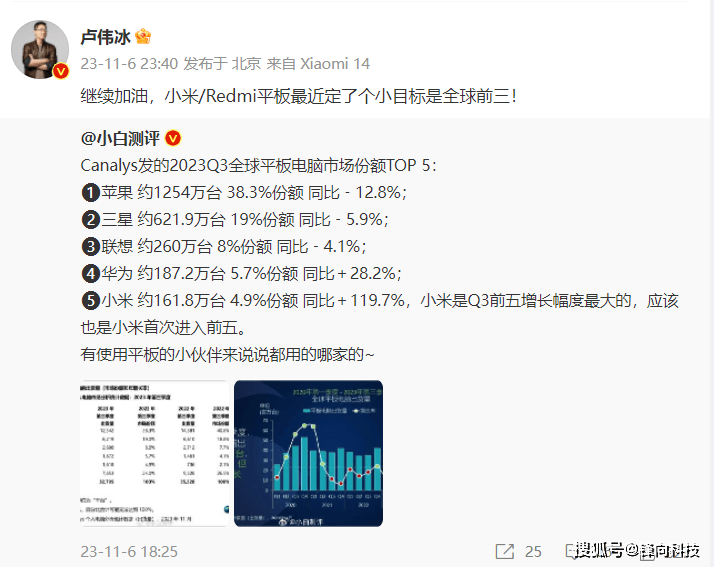 信息显示11月6日23点40分卢伟冰表示,最近给小米(Redmi)平板定了个小目标,这个小目标是进入全球前三。进入全球前三意味着什么呢?意味着小米平板要做到像手机一样,全球范围之内仅次于苹果、三星排名第三。