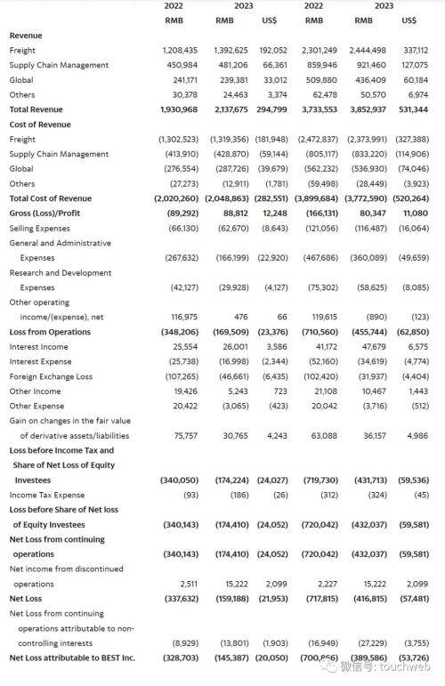 百世集团2023年第二季毛利8880万,上年同期的毛亏损为8930万元;持续运营亏损为1.74亿,净亏1.6亿元,上年同期的净亏损为3.38亿元。