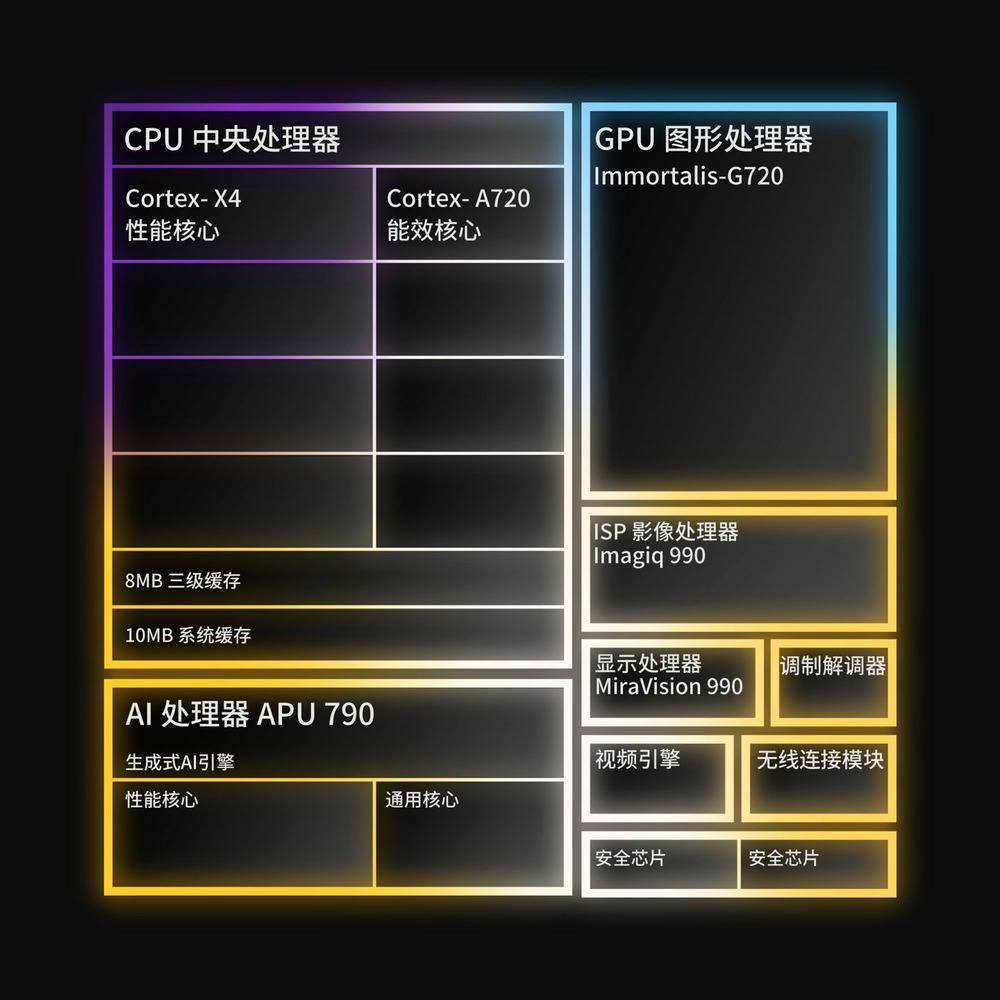 天玑 9300 升级到了 Imagiq 990 ISP,支持 AI 语意分割视频引擎、16 层图像语意分割、景深和光斑双引擎、全像素对焦叠加 2 倍无损变焦、OIS 光学防抖专核、3 麦克风高动态录音降噪,可过滤 25km/h 风速的 99% 以上风噪。