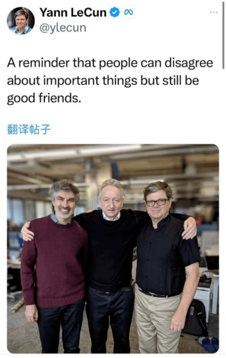 有趣的是,今年10月22日,LeCun还晒出了他和Hinton、Bengio的合照,不知道此次battle会不会影响三大巨头的友谊,我们可以继续吃瓜。
