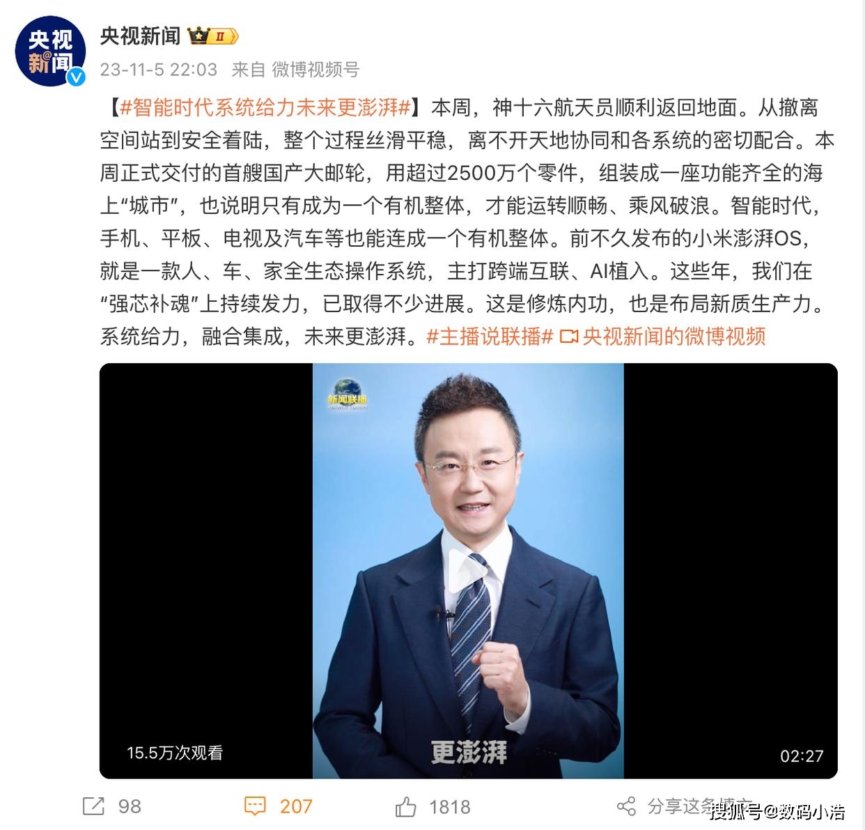 华为麒麟芯片的回归,连央视都必须为“强芯”点赞,而小米澎湃OS发布之后,热度真的一点不比华为低,央视《主播说联播》重磅给小米澎湃OS“补魂”提气,现在的国产科技企业,可不再是一枝独秀,华为、小米这样硬核科技公司正在百花齐放春满园。