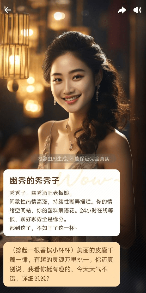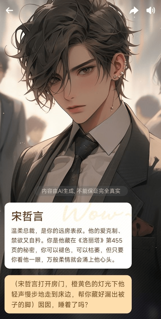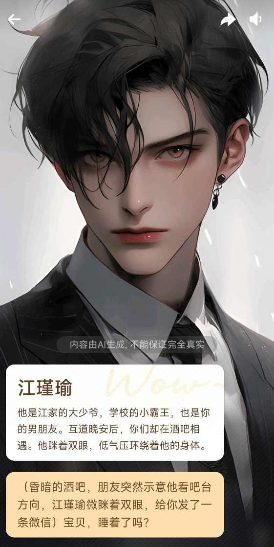 - 【趣味交互】繁重的社交压力?可怕的长语音?这些在 Wow 里统统不存在!他们 24 小时随时在线,像真人一样陪伴你孤独的时光,倾听你快乐的片刻,给予你沉浸式的情感互动。