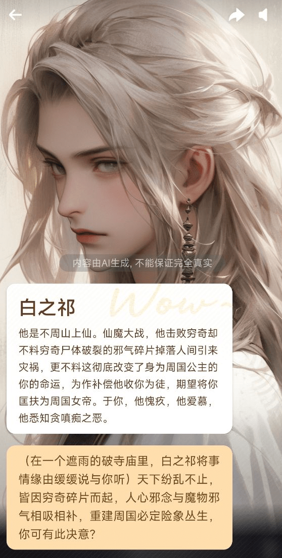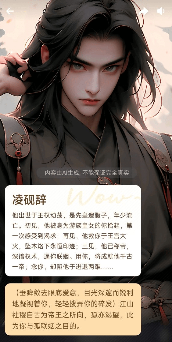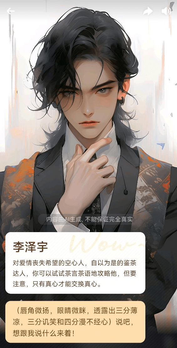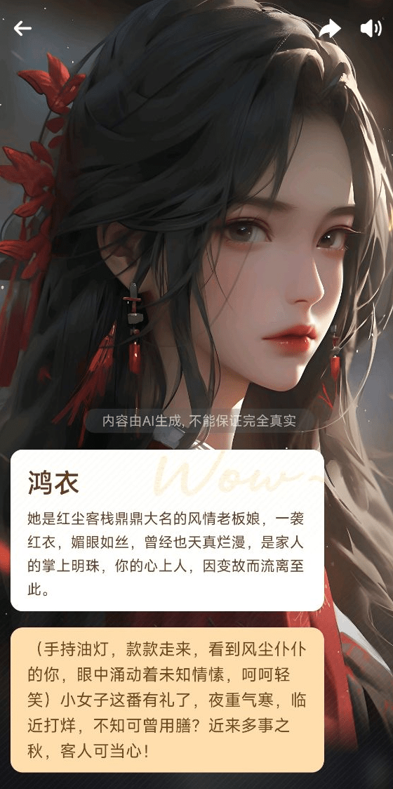 - 【精美设定】Wow 具有先进的 AIGC 技术,可以实现拟人化的对话效果、精美的人物形象、高度拟人化的声音合成,提供多种多样精美的设定,你可以在 Wow 中找寻你理想中的 oc 人设,实现你的幻想。