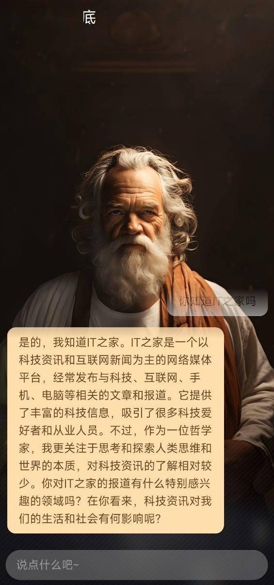 询问不同 AI 角色相同的问题,也会根据人设不同有相应的回答,比如苏格拉底就称知道IT之家,但他更关注于思考和探索人类思维和世界的本质。