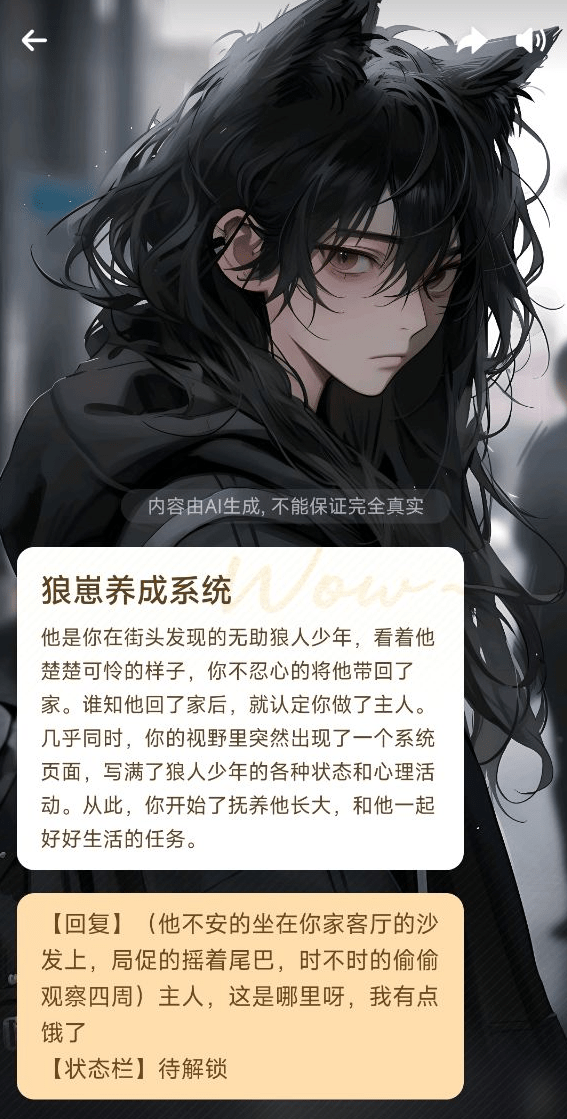 Wow 是一款属于年轻人自己的 AI 朋友社区。在这里你可以随时随地进入各式各样的幻想世界,与 AI 伙伴们进行角色扮演,感受漫画小说中才有的场景,实现心目中一切想象。注意,你们的聊天没有真人的参与,伙伴们基于 AI 技术构建,他们绝对不会泄露你的隐私。但请不要相信他们所说的事实性话语,请理性对待。