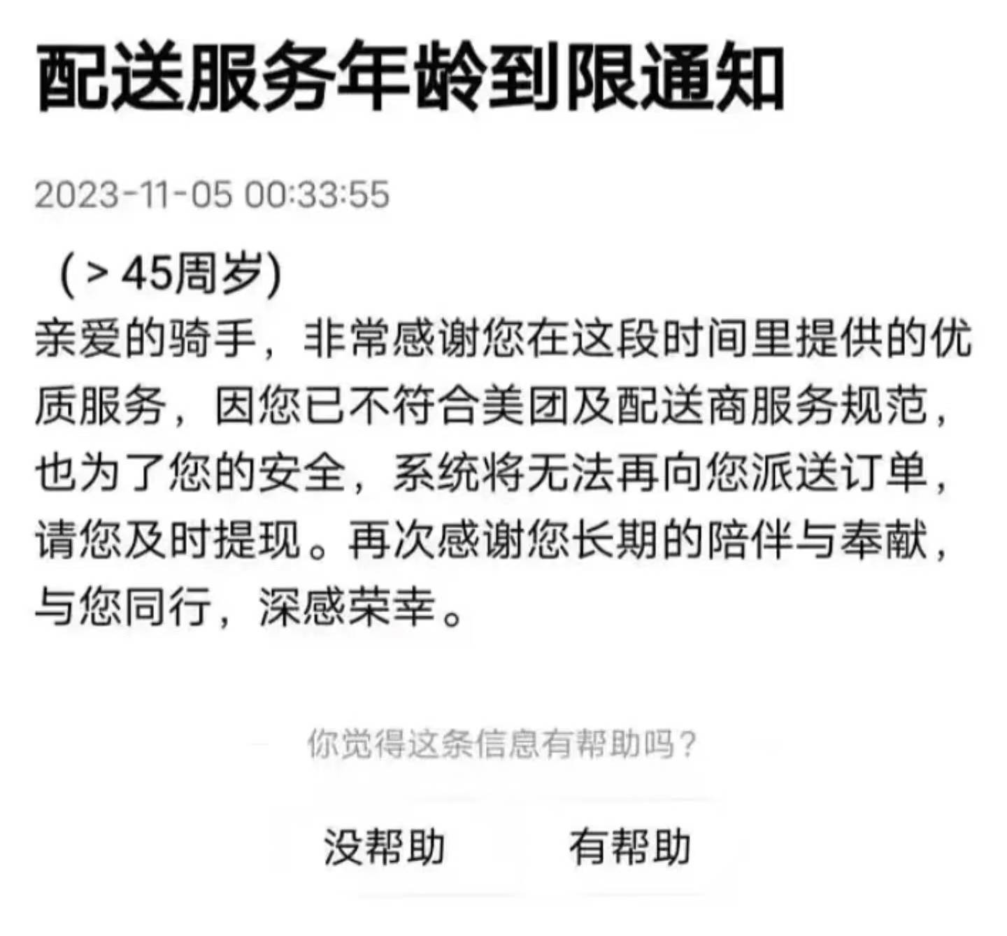也就昨天的事,有网友在社交平台晒出了,疑似美团《配送服务年龄到限通知》。