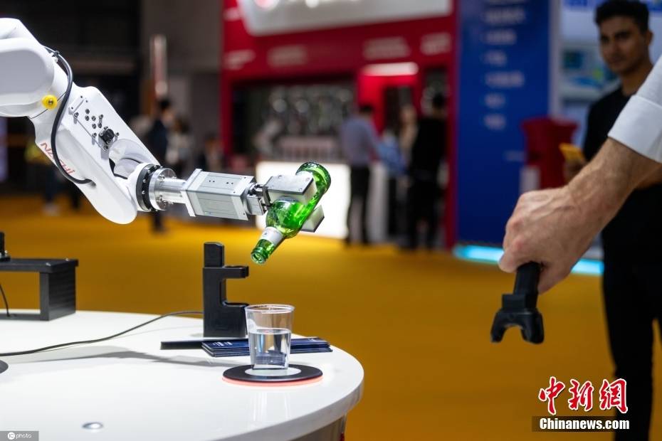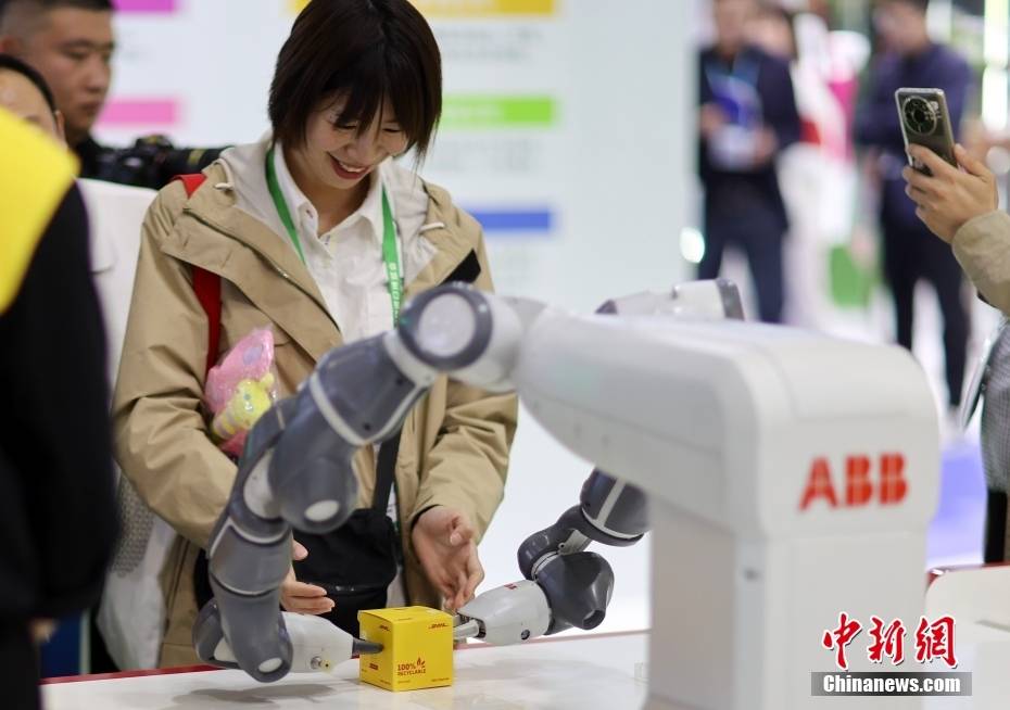 参观者在DHL展台体验ABB协作机器人“打包”服务。中新社记者 盛佳鹏 摄