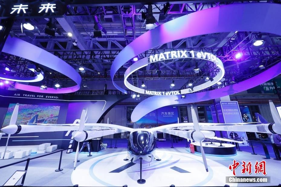 吨级电动垂直起降飞行器亮相第六届中国国际进口博览会汽车展区。该飞行器是中国首架自主研发、全国产化的2吨级电动垂直起降飞行器,在电动系统、飞控系统、复合材料三个核心环节全部实现国产化。中新社记者 殷立勤 摄