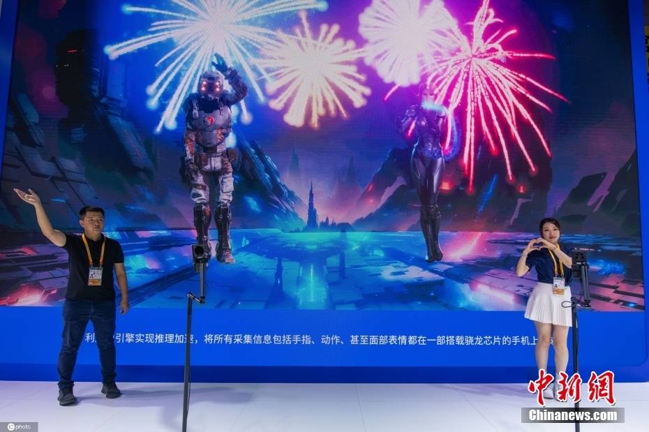 参观者在高通展台体验基于高通分离渲染技术的5G+XR游戏。中新社记者 田雨昊 摄