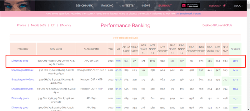 在AI Benchmark官网上,天玑9300获得了AI算力(芯片)第一名。