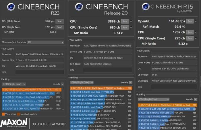 AMD R5 7640HS处理器采用了较新的Zen 4架构,在多线程处理能力上有明显提升,可以流畅运行各种数据处理和代码编译任务。NVIDIA的RTX 4050光追显卡,则提供了良好的模型训练和神经网络加速性能。16GB内存可以支持大批量数据的并行处理。接下来咱们针对硬件各个部分进行详细的性能测试。