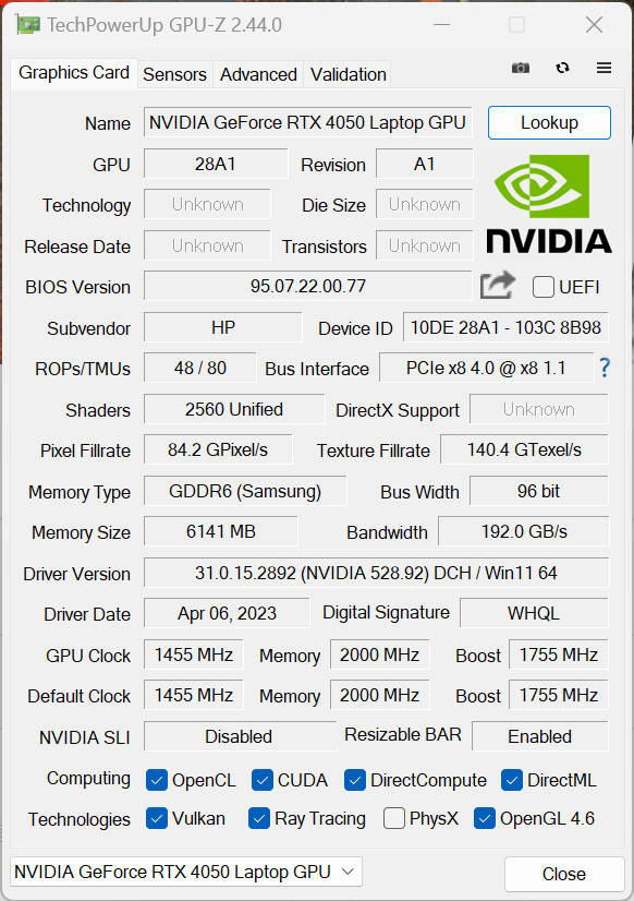 在3D游戏性能方面,RTX 4050也有出色表现,可以胜任2k分辨率、高画质设置的主流游戏。而NVIDIA DLSS超分辨率技术,可进一步提升帧率表现。