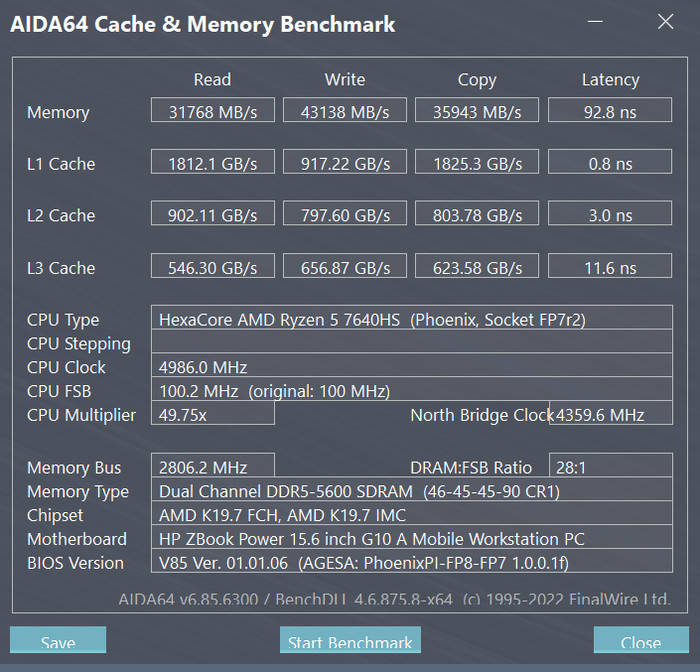 内存:评测款惠普战99锐龙版移动工作站配备单条16GB DDR5-5600内存,实测读取速度达到31768MB/s,写入速度43138MB/s,拷贝速度35943MB/s,如果希望获得更好的内存性能,可选择再升级一条16GB内存。