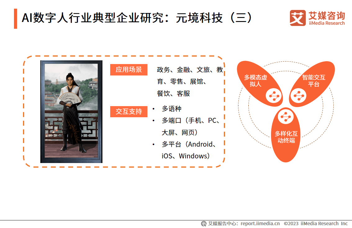 此外,元境科技基于元享SaaS云平台推出了元享数字魔盒,通过多模态虚拟人、智能交互平台与多样化互动终端,为实体零售行业数字化转型提供多场景应用解决方案。基于完整的数字内容创作生态,元享平台能够在包括电商、直播、金融、教育、广告、影视、流媒体等多个领域完成内容落地,提供的AI数字人能够很好地替代线上线下客服、营销、销售、展示等工作内容,为用户实现巨大的商业应用价值的同时,提升服务水平及降低成本损耗。