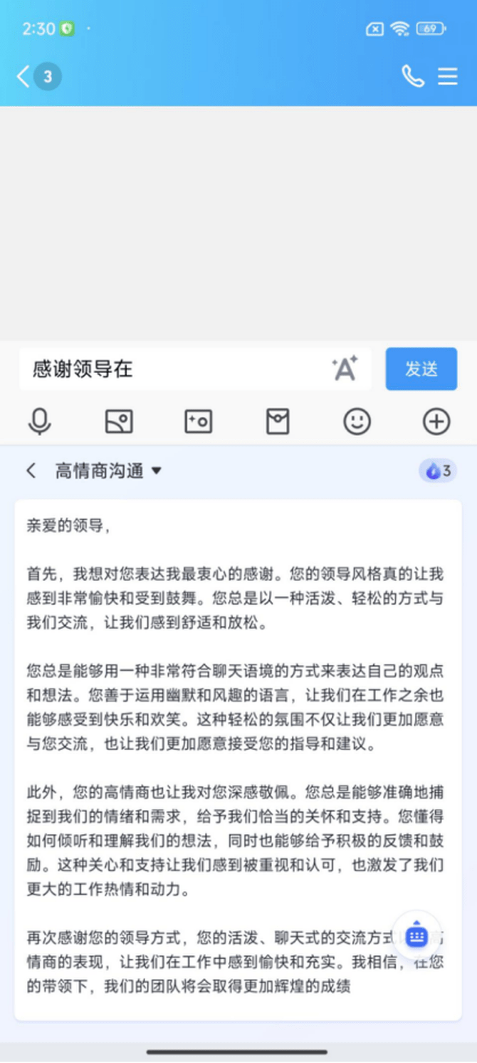 通过AI创作助手的扩写功能,我们能够看到,在和领导进行聊天的时候,讯飞输入法通过强大的文本生成,能够实现非常出色的高情商回复,第 一次看到这么长的回复,笔者的第 一反应是非常惊讶,然后仔细阅读之后,相信你的领导一定会被你的真情流露所感动,对你青眼相加、另眼相看。