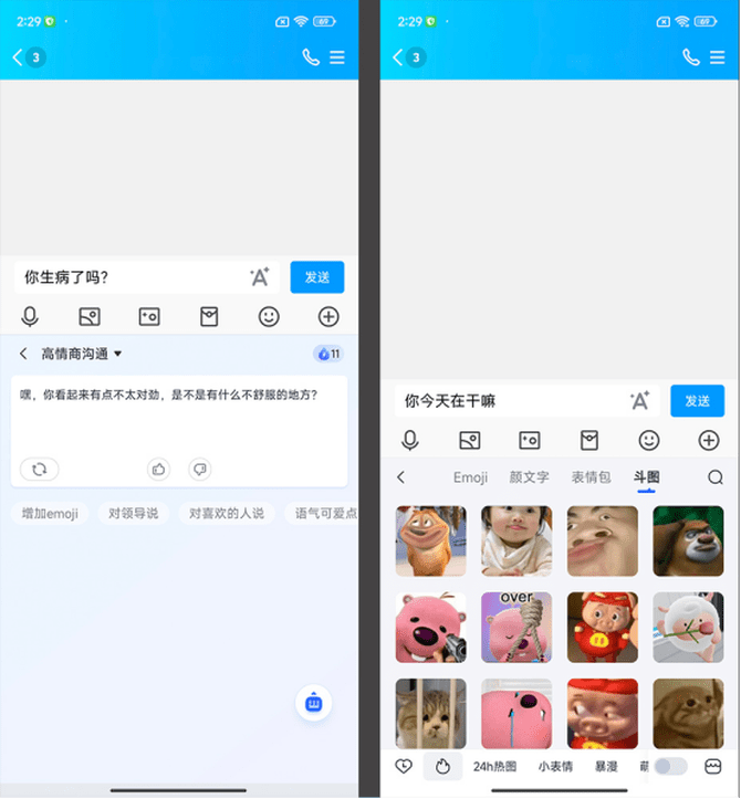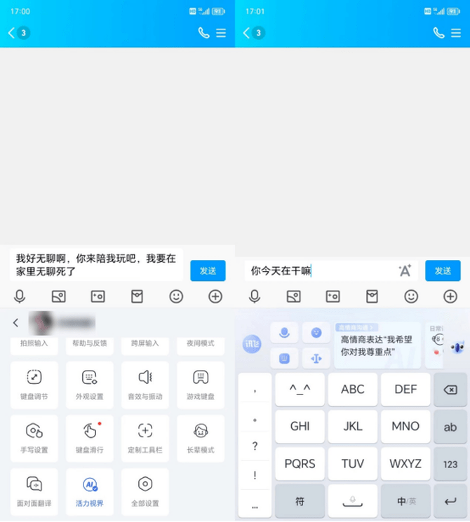 这一次的重点升级包含了颠覆人机交互界面的新设计——“活力视界”,我们可以在讯飞输入法菜单面板内进行选择开启,这时键盘顶部的工具栏在眼前“消失”了,取而代之的是键盘向上拓展的全新推荐区。简单的说,这一设计融合工具栏和候选栏,充分利用了双行显示的空间位置,同时卡片的组合融入多种功能,包括高情商沟通、斗图、AI帮聊、花样字等等,提供的输入服务非常全面,不论是日常聊天、插科打诨,还是高情商职场回复,都能提供AI智能生成,让你的语言描述处处彰显高情商。