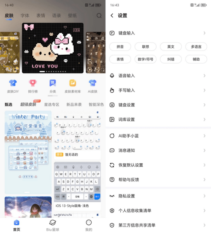 界面上来看的话,讯飞输入法13.0版本首页没有进行特别的大改动,整个主界面保持简洁的风格,默认首屏展示特色皮肤资源,可供用户随心选择,上手难度基本没有,对于绝大部分的用户来讲,还是熟悉的感觉。