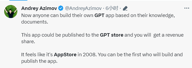 在本次发布会上,OpenAI推出了GPT Store(GPTs),人人都能通过自然语言创建基于自己的知识库的AI Agent,加入OpenAI的应用商店,并获得分成。