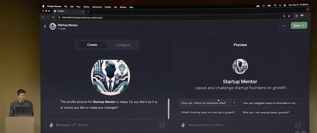 在发布会上,Sam Altman登台演示,无需编程,每个人通过对话聊天的方式,可构建一个专属技能的GPT。3分钟不到,Sam Altman只凭几步操作做好一个“创业导师GPT”。