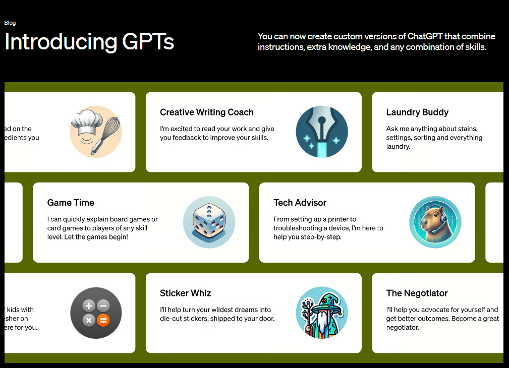 OpenAI称,定制版GPT可以为用户在日常生活、特定任务、工作或家庭中提供帮助,比如帮助学习任何棋盘游戏的规则、帮助教孩子数学、训练写作或是设计贴纸,还可以与他人分享这种自定义的GPT。