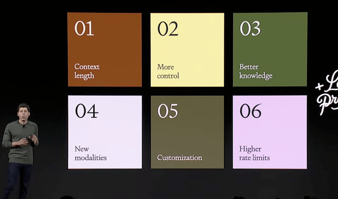 在开发者大会上,OpenAI宣布了 GPT-4 的一次大升级,推出了 GPT-4 Turbo。新版本对开发者关注的问题做了六大升级,分别是更长的上下文长度、更强的控制、模型的知识升级、多模态、模型微调定制和更高的速率限制。