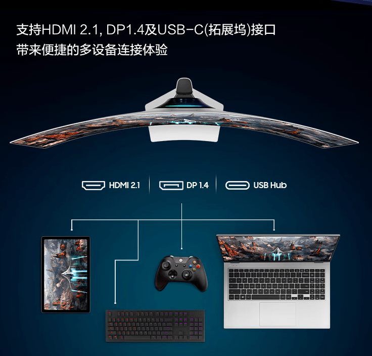 据介绍,这款显示器采用了 49 英寸 OLED 带鱼屏(32:9),1800R 曲率,5120x1440 分辨率,240Hz 刷新率,0.03ms 响应时间,99% DCI-P3 色域,1000 尼特峰值亮度。