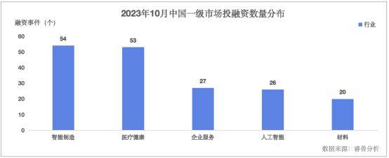 从融资事件发生的行业来看,排名前五的行业共发生融资事件180个,占所有行业事件总数的58%,前五行业分别是智能制造、医疗健康、企业服务、人工智能、材料;前五行业涉及已披露总金额为128.69亿元人民币,占所有行业融资总量的54%。