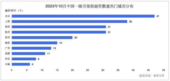 从投融资事件发生所在城市来看,10月排名第一的城市为北京,共发生47个投融资事件;上海则以38个事件位列第二;深圳、杭州并列排名第三,均发生31个投融资事件。