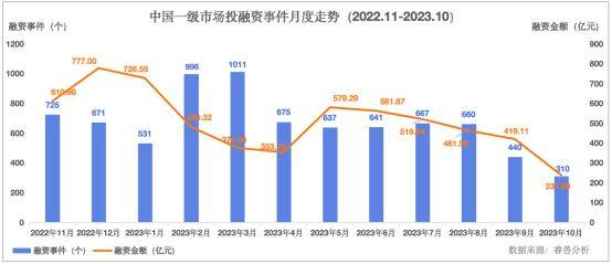 睿兽分析数据显示,2023年10月中国一级市场发生融资事件310个,比上月减少130个,下降30%;比去年同期减少351个,下降53%。已披露融资总额237.88亿元人民币,比上月减少181.23亿元人民币,下降43%;比去年同期减少292.34亿元人民币,下降55%。