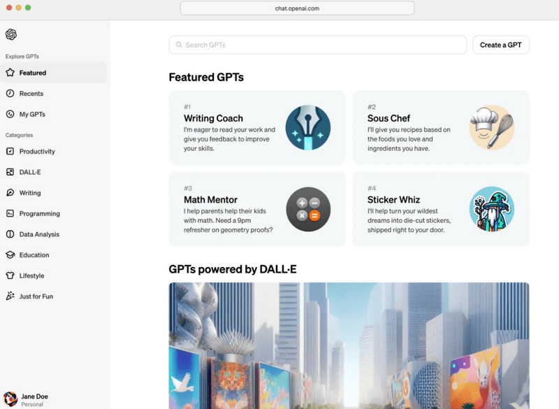 OpenAI还推出了GPTs商店,用户可以在其中搜索并使用其他人创建的GPTs。优秀的GPTs可能进入排行榜,创作者可以通过分享获取收益。