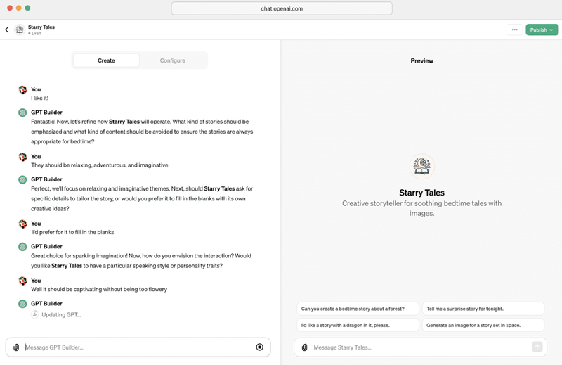 GPTs允许任何人都可以基于ChatGPT创建定制版本,应用于日常生活、专业工作等不同场景,无需编程就可以构建属于自己的AI助手。用户可以给GPTs输入特定知识,设置使用范围,然后分享给他人使用。