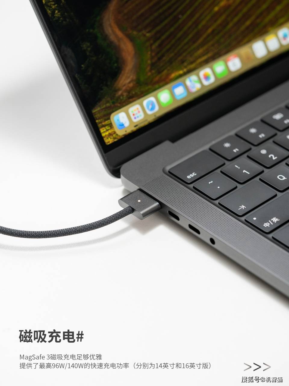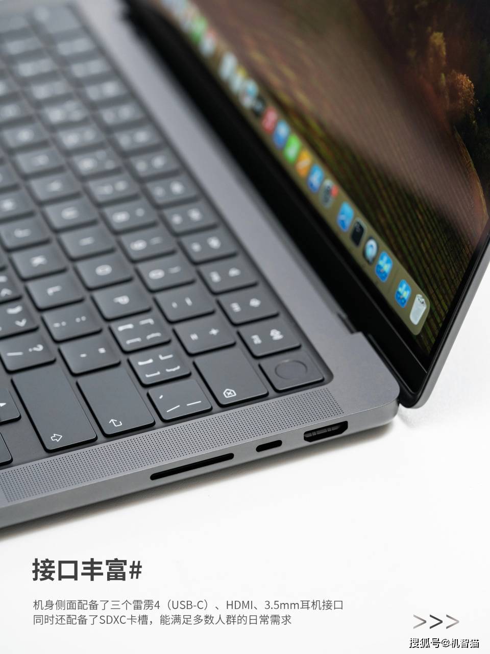 侧面则是MagSafe 3磁吸充电接口+三个雷雳4(USB-C)+HDMI+SDXC卡槽,3.5mm耳机接口也没有缺席,能满足一般的键鼠+显示器外接需求,如果有U盘或者更多外设,仍然需要扩展坞来帮忙。