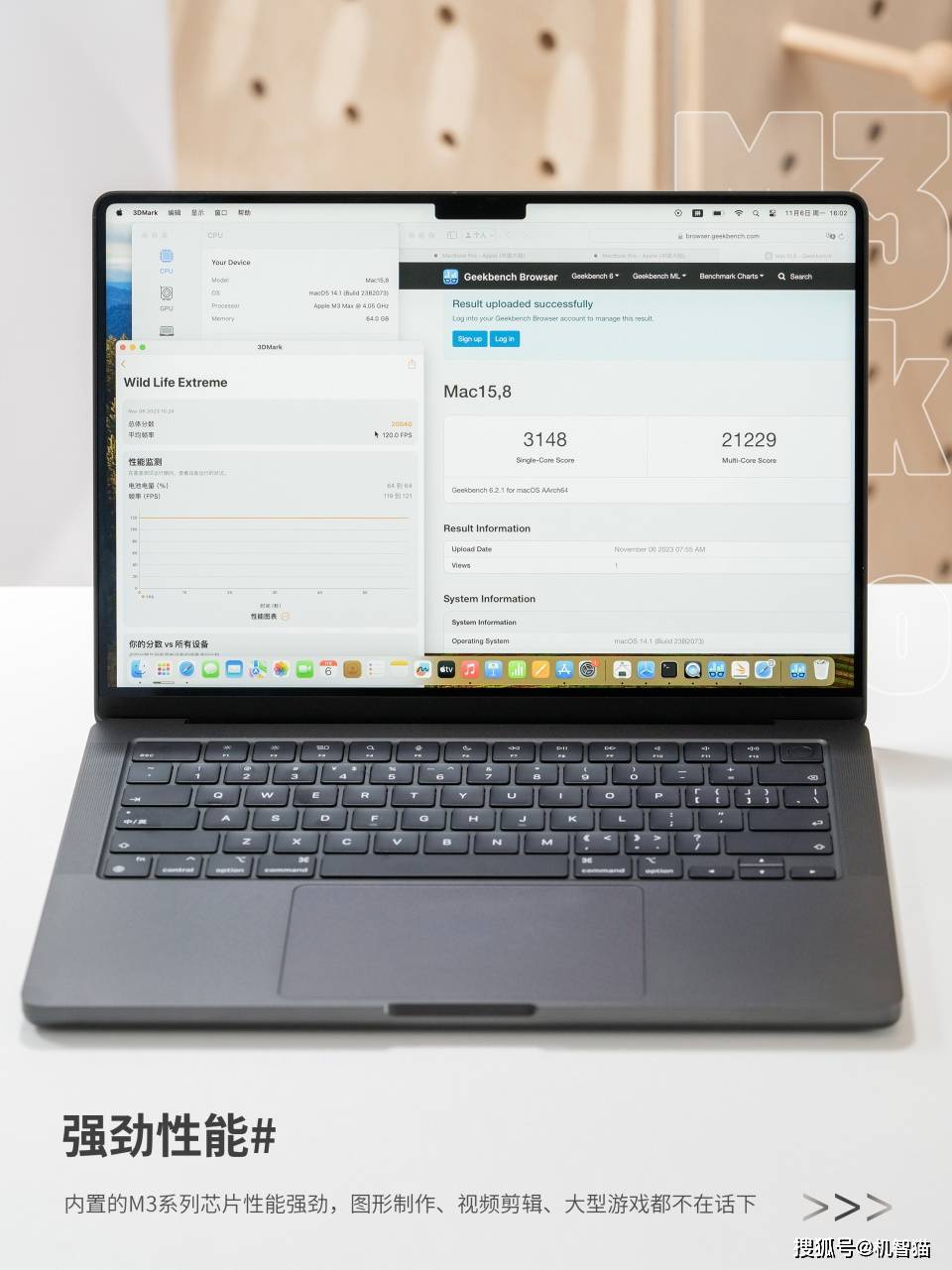 以我们手上的这款14英寸版MacBook Pro为例,选配了16核M3 Max+64GB+1TB版本,Geekbench 6单核得分3148,多核得分21229,相较于前代M2 Max,单核跑分提升约18%,多核提升高达50%左右,作为全球首款3nm PC芯片,苹果这次把性能的牙膏挤爆了。