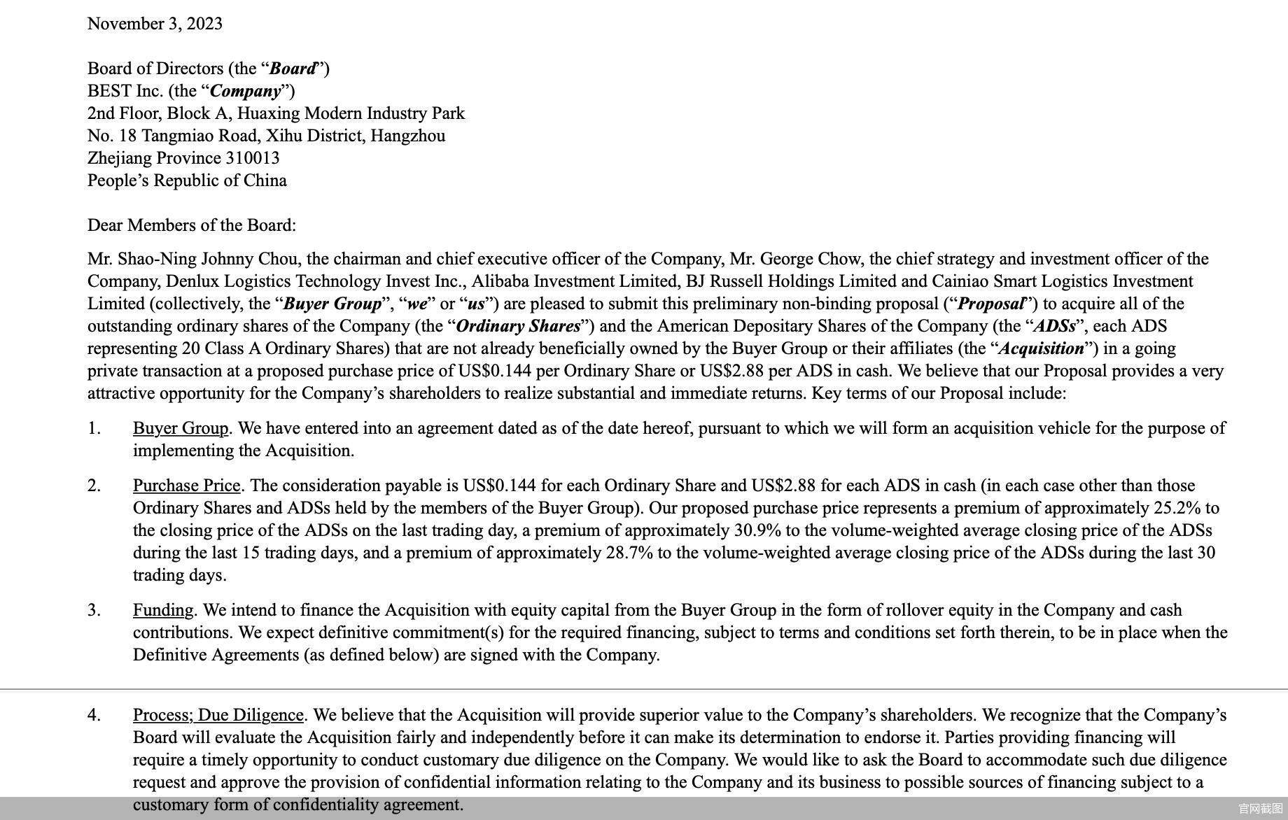 这份要约提案来自百世集团创始人、董事长兼CEO周韶宁、百世集团首席战略官兼投资官George Chow、Denlux Logistics Technology Invest Inc、阿里巴巴投资有限公司(Alibaba Investment Limited)、BJ Russell Holdings Limited和菜鸟智能物流投资有限公司(Cainiao Smart Logistics Investment Limited)。该收购者联盟拟以每股A类普通股0.144美元,或每股美国存托股票2.88美元(1股美国存托股票代表20股A类普通股)的现金收购公司所有已发行普通股,包括尚未由收购者联盟实益拥有的公司A类普通股。值得一提的是,财报数据显示,阿里仍为百世集团第一大股东,约持有百世集团32.7%的股权。