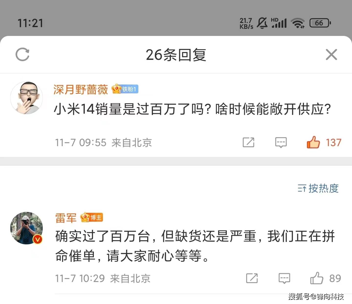 没想到的是11月7日“雷军证实小米14销量已超百万台”成功登上热搜,原因是雷军在与网友互动中表示,小米14销量确实过百万了,但目前缺货还是很严重。他们正在拼命催单,请大家耐心等等。