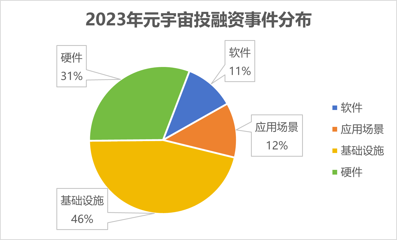 从元宇宙投融资赛道分布来看,国内元宇宙市场投融资涉及领域主要包括硬件、软件、基础设施、场景应用四大板块。