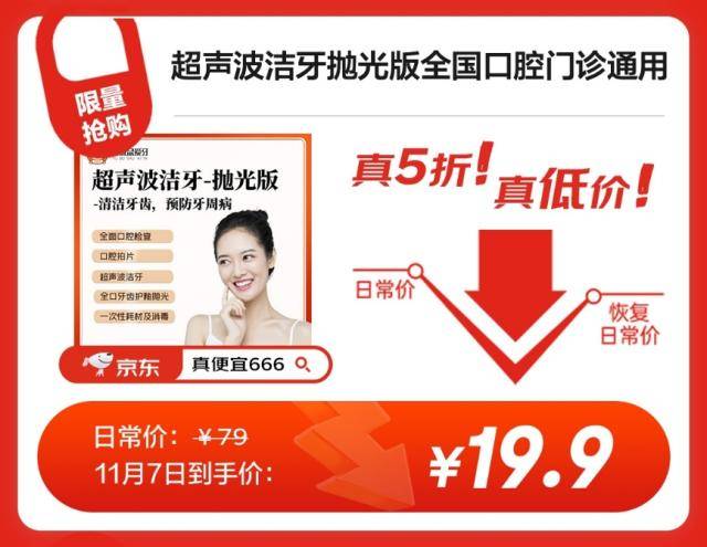 口腔健康是日常生活中不容忽视的一部分,它的健康与否不但直接关系到消费者的饮食体验,还会对全身健康产生潜移默化的影响。11月7日到京东健康入手超声波洁牙抛光版只需要19.9元,全国口腔门诊通用,想要护理牙齿的消费者可千万不要错过。