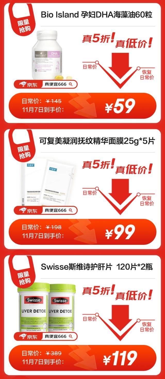 更多健康好物尽在京东健康11.11!11月7日健康品类日,多个品类品牌大放价,官方补贴真5折惊喜不断,为消费者打造更实惠的健康购物体验。用户通过京东App搜索“真便宜666”即可直达会场,锁定心仪产品,为全家健康护航!