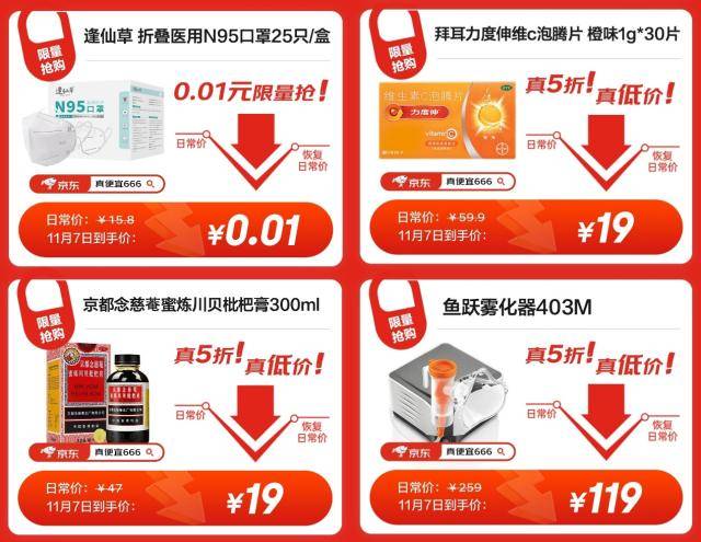 在京东买药11.11品类日的爆品清单中,京都念慈菴蜜炼川贝枇杷膏、拜耳力度伸维C泡腾片、鱼跃雾化器等健康产品都给出真5折福利。与此同时,具有五层防护的逢仙草折叠医用N95口罩推出“1分购”特惠,日常15.8元,现在1分钱即可购买,让消费者一省到底。