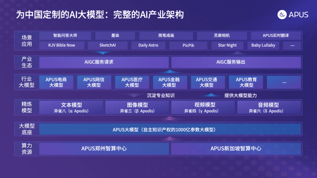 过去 9年 ,APUS为全球 200多个国家和地区提供了200 多款移动应用,为 24 亿用户提供了25种语言的服务,这给APUS大模型的训练带来源源不断的全球高质量数据投喂。同时,APUS在国内郑州和新加坡建立了两大算力中心,为APUS大模型和海外产品同时提供算力支持。