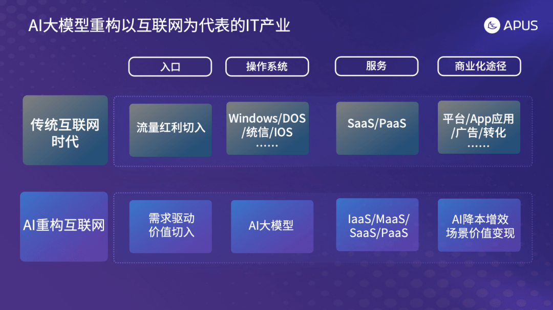 在传统互联网时代,流量红利是入口,Windows、iOS等是操作系统,互联网服务基于PaaS、SaaS层展开,商业化途径以APP应用、平台的广告与转化为主;而在AI时代,AI 将重构所有产业,也包含互联网。