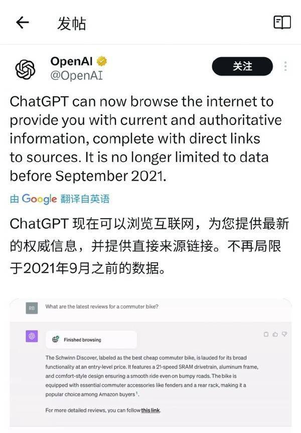 【CNMO新闻】当地时间周三(9月27日),OpenAI在X上宣布了一项重磅消息,其聊天机器人产品ChatGPT可以通过微软的必应搜索引擎进行网络搜索,将不再局限于2021年9月之前的数据。这意味着,此前ChatGPT已经正式通网。
